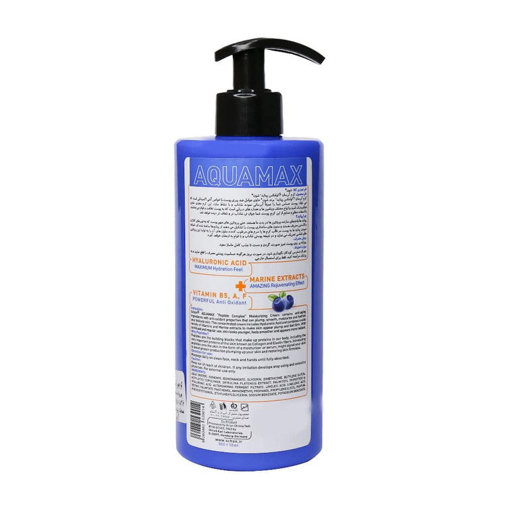 ویتامین آ موجود در این کرم سلول های رو به مرگ را بازسازی می نماید و سلامت و جوانی را به پوست باز می گرداند. ویتامین F نیز اسیدهای چربی مثل لینولئیک اسید و لینولنیک اسید که برای تغذیه پوست بسیار ضروری هستند، را دارا می باشد. این اسیدها به کاهش التهابات پوستی کمک کرده و با استفاده از آنتی اکسیدان موجود در خود از سلامت پوست شما محافظت می کند. کرم آبرسان آکوامکس پپتاید شون فاقد الکل و پارابن است.